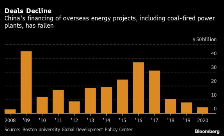 China has attempted to make its investments more environmentally sustainable. In December, a Belt and Road Initiative coalition supervised by China’s environment ministry developed a color-coded classification to help assess overseas investment risks. China’s financing for foreign energy projects in 2020, including power plants, fell to the lowest since 2008 at $4.6 billion, according to Boston University’s Global Energy Finance Database.