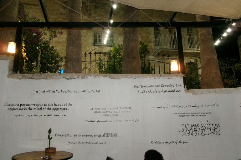 ![A wall with quotes on Palestine's liberation struggle at the Citadel restaurant in the West Bank on October 10, 2023 [Laila Shadid/XEn News]](/wp-content/uploads/2023/10/100_0358-1697077924.jpeg?resize=770%2C513&quality=80)