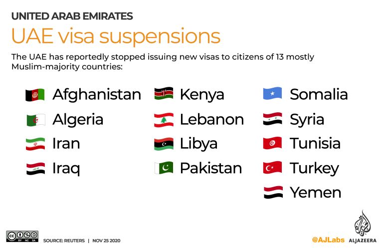 The UAE said applications for new employment and visit visas for the citizens from these mostly Muslim-majority nations were suspended until further notice.