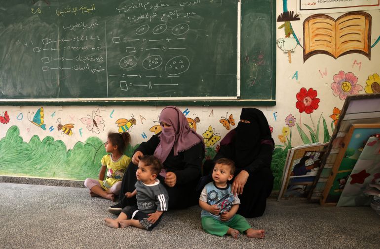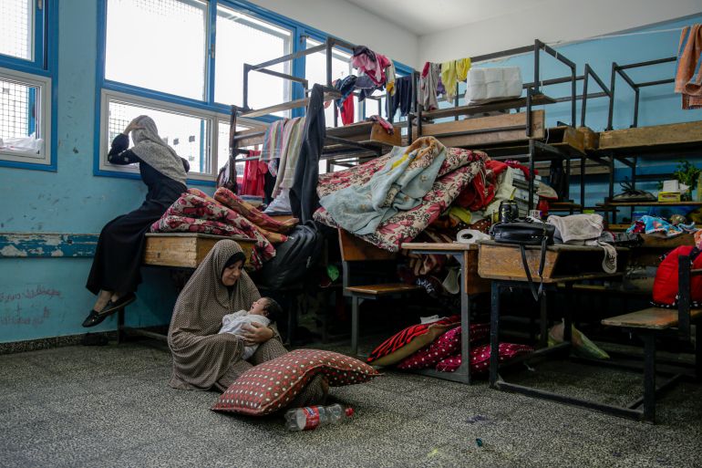 Cradling her newborn baby Hasan on the floor of a classroom in Gaza City, her five other children flitting in and out, Suheir al-Arbeed lists the basic necessities they are lacking.
