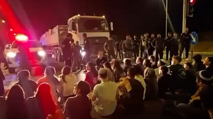 Israeli settlers attacked an aid convoy for the second time in days, delaying 30 trucks from Jordan on their way to Gaza. Video shows settlers chanting “May Palestine’s name be wiped out”. Jordan condemned the assault, accusing Israel of failing to stop repeated settler attacks.